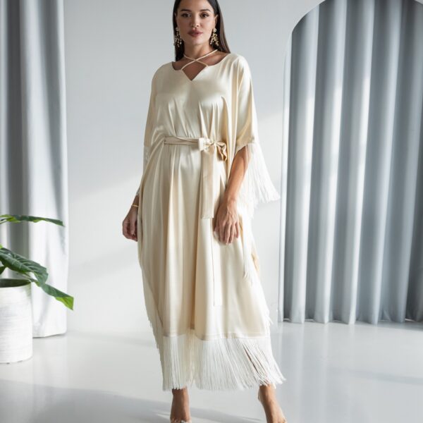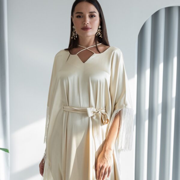 فستان شيفون باللون البيج مع كسرات وتطريز بالكريستال
