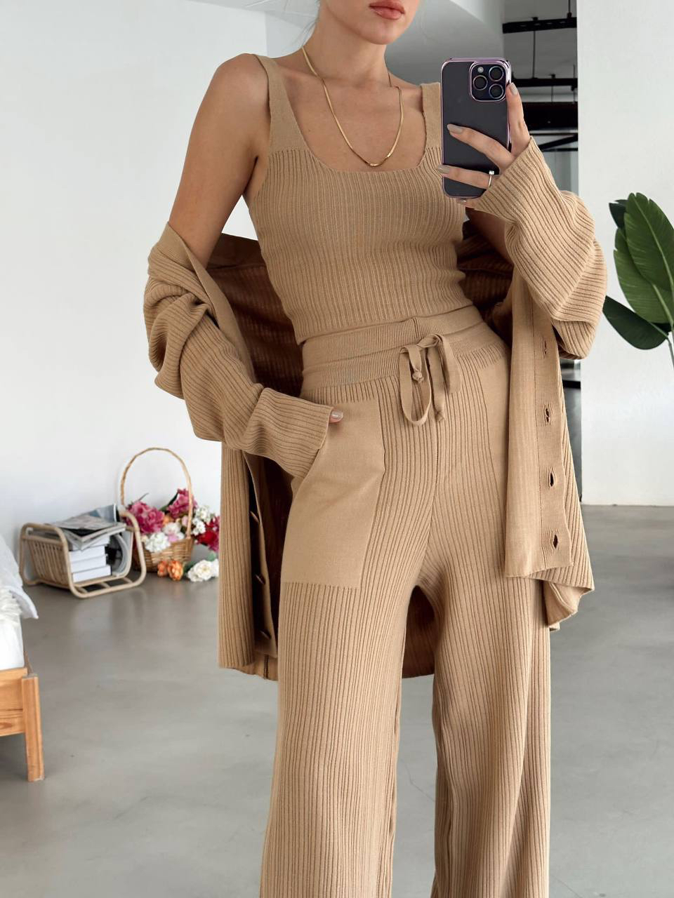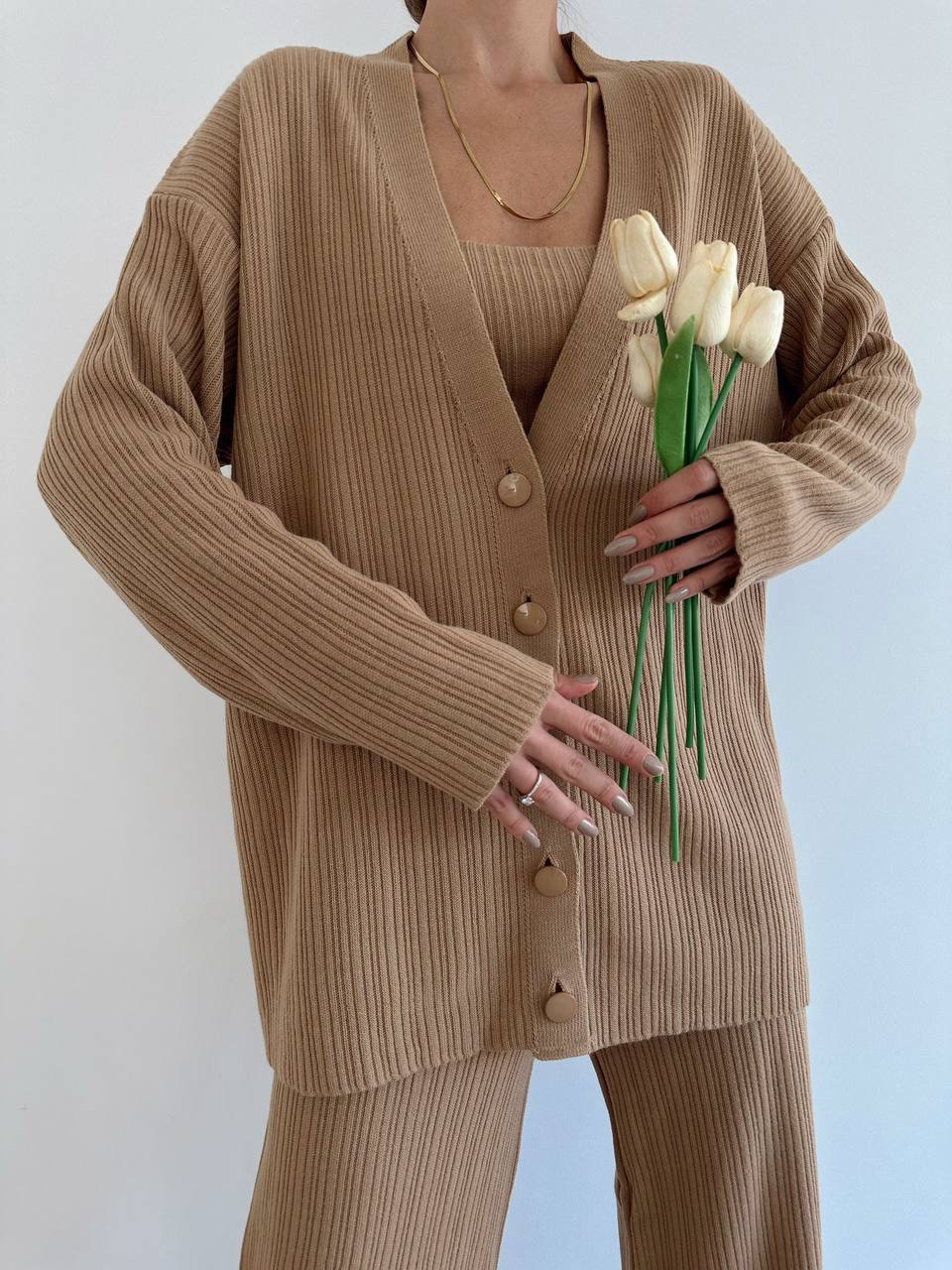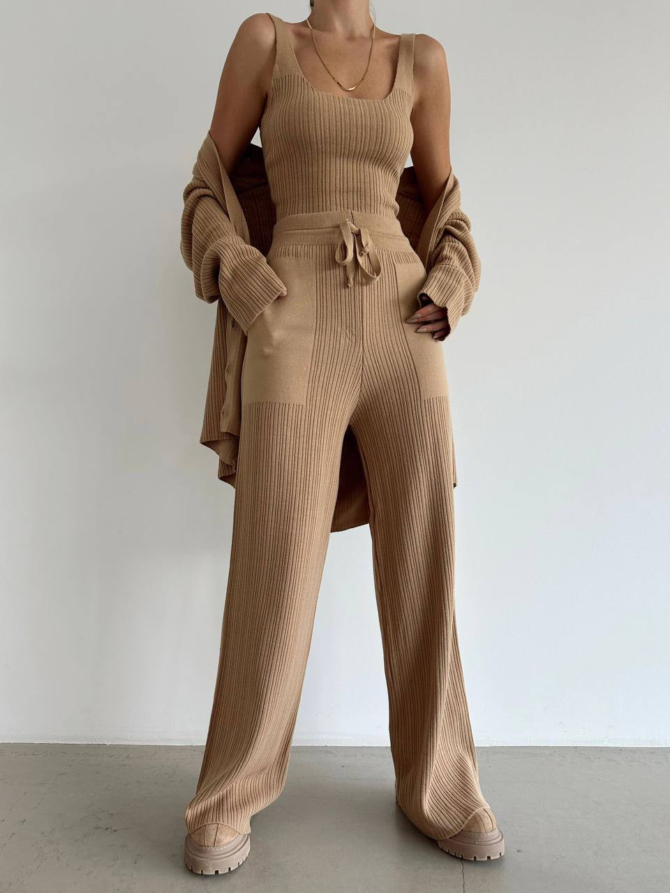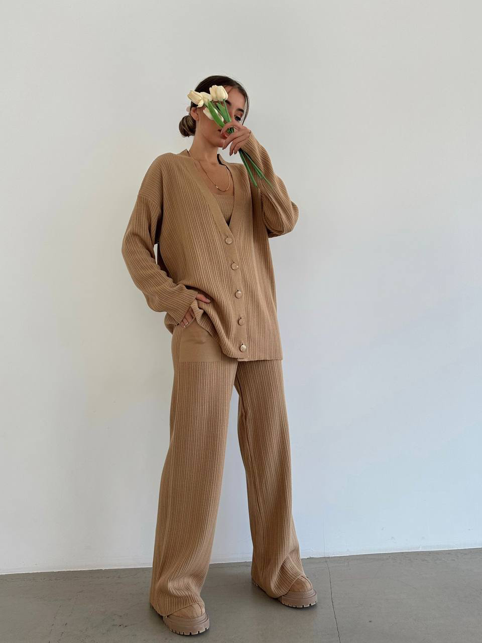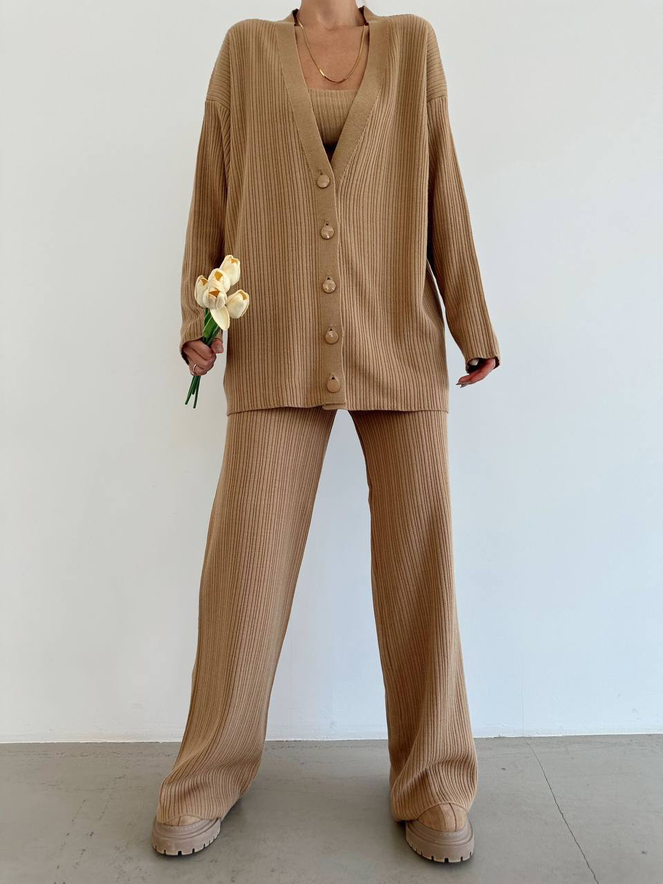 طقم بنطلون Ù…ØØ¨ÙˆÙƒ بأرجل عريضة،كارديغان وقميص بلون الكراميل