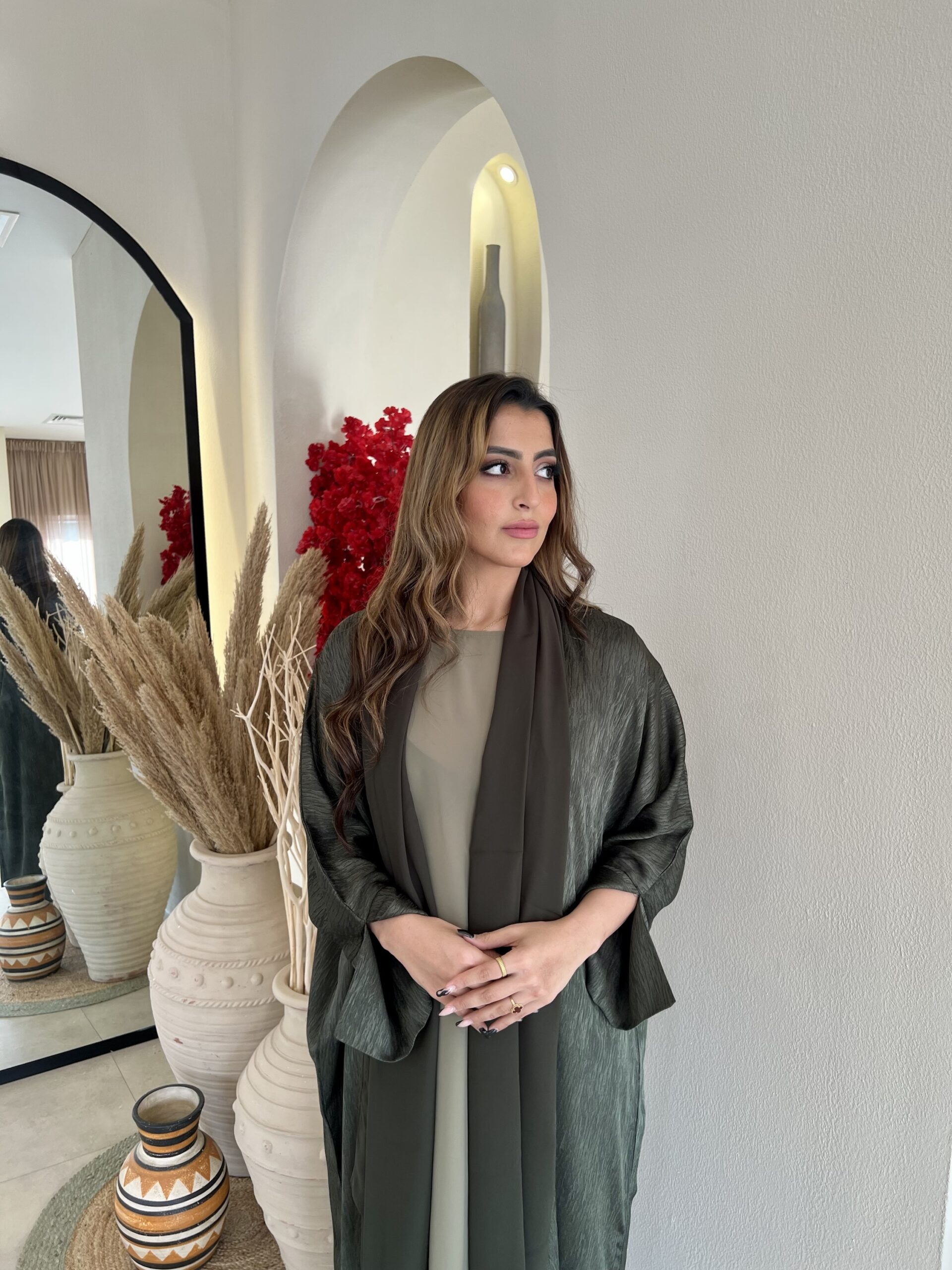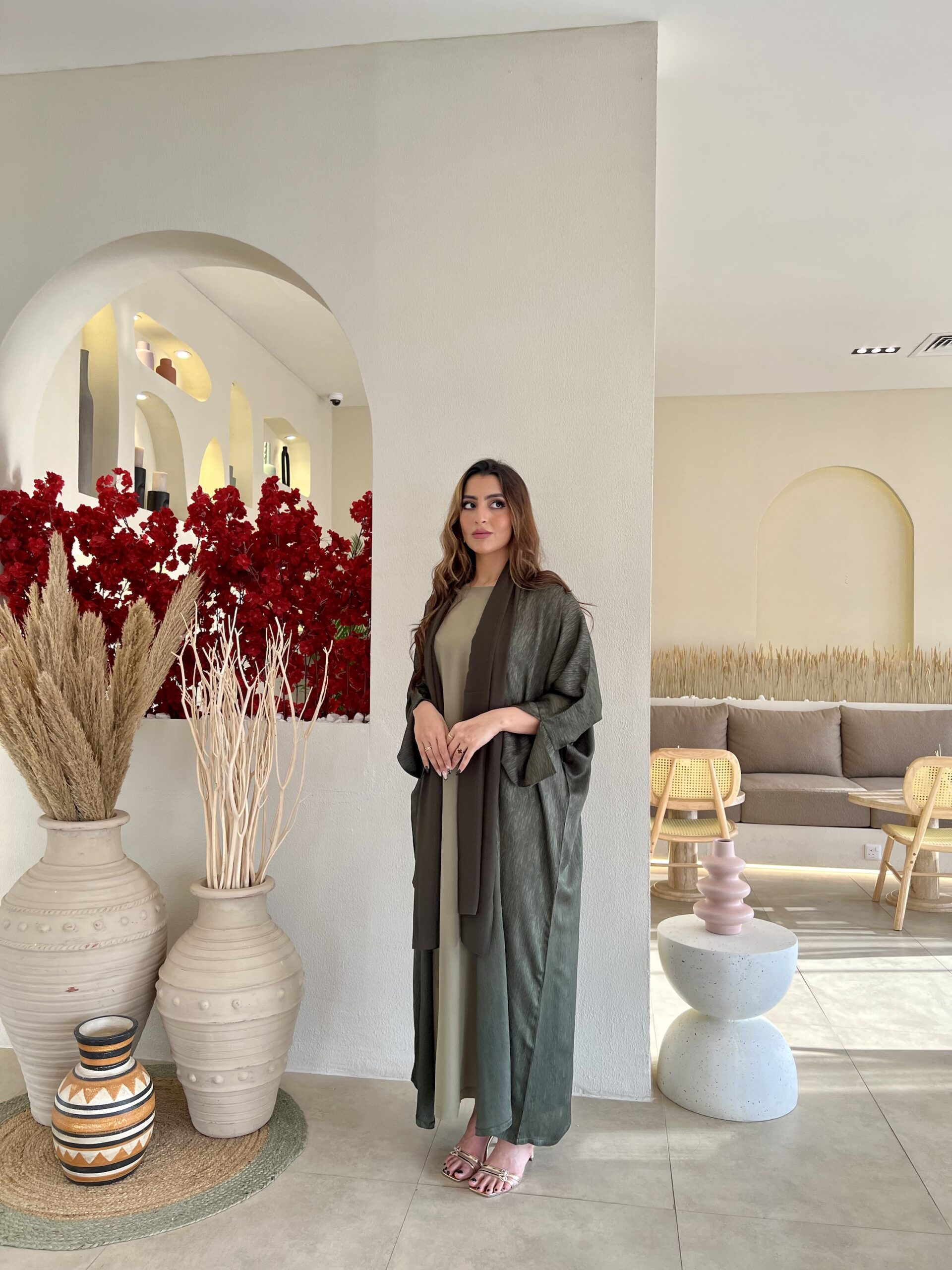 طقم باللون الاخضر الغامق مكون من عباية وفستان وشيلة