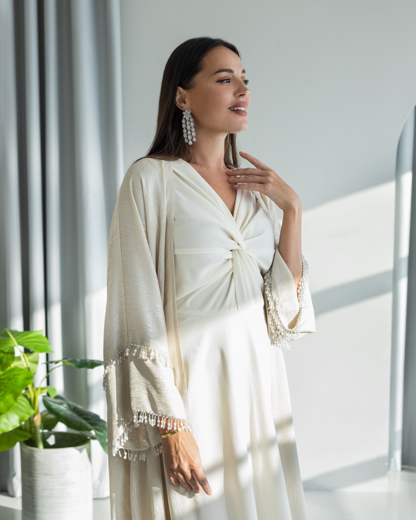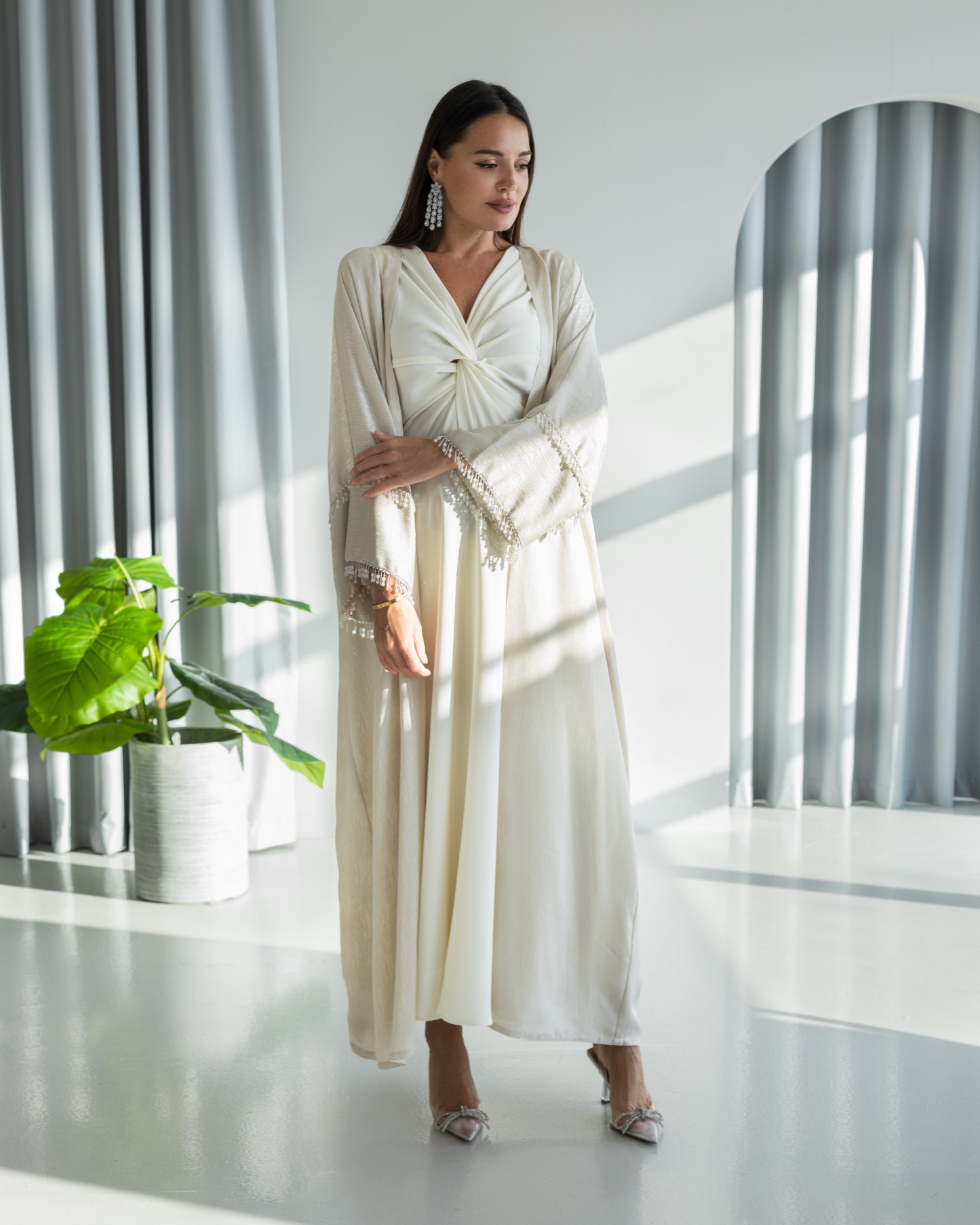 طقم باللون الكريمي مكون من عباية وفستان وشيلة