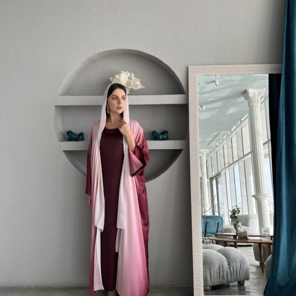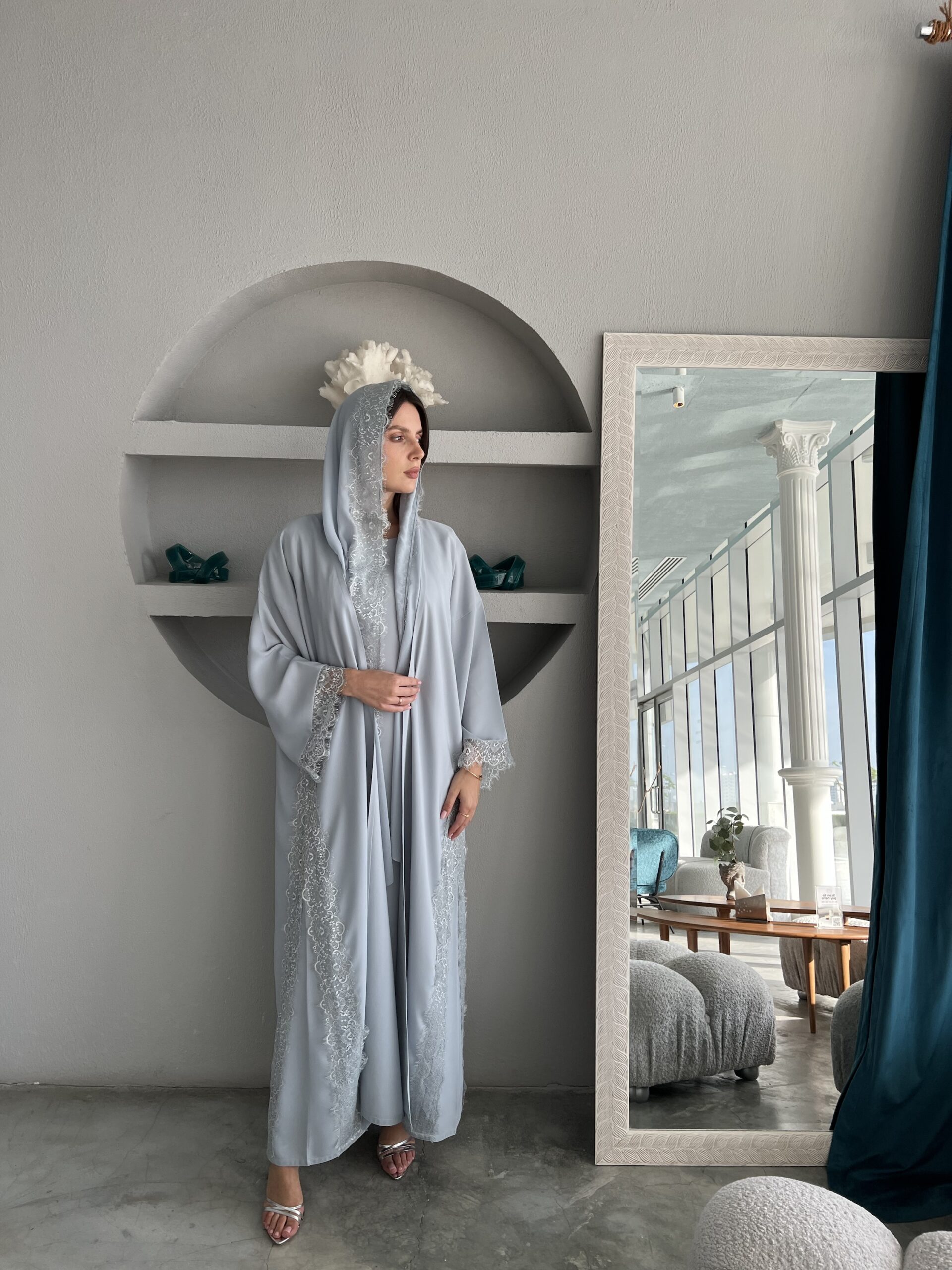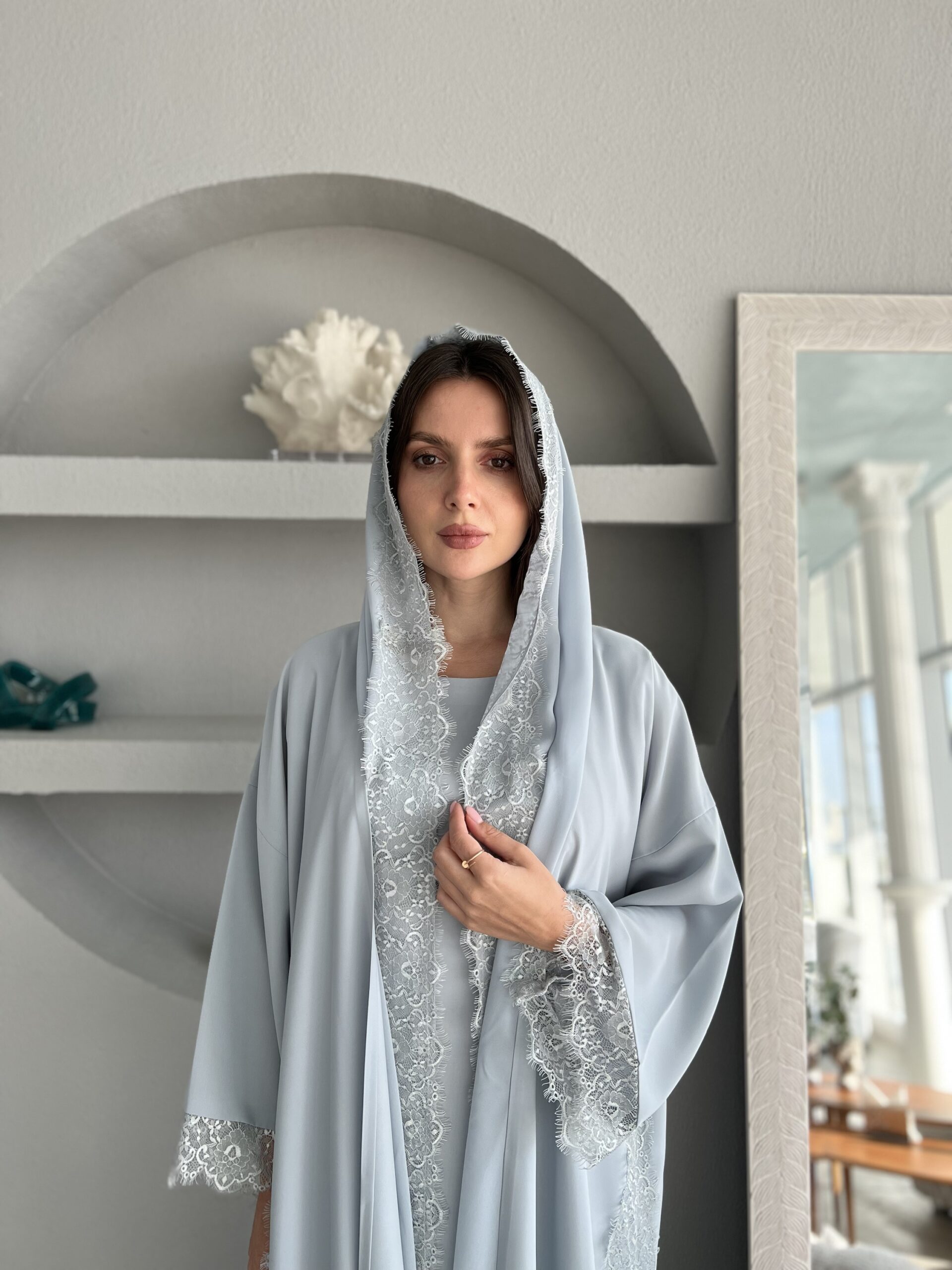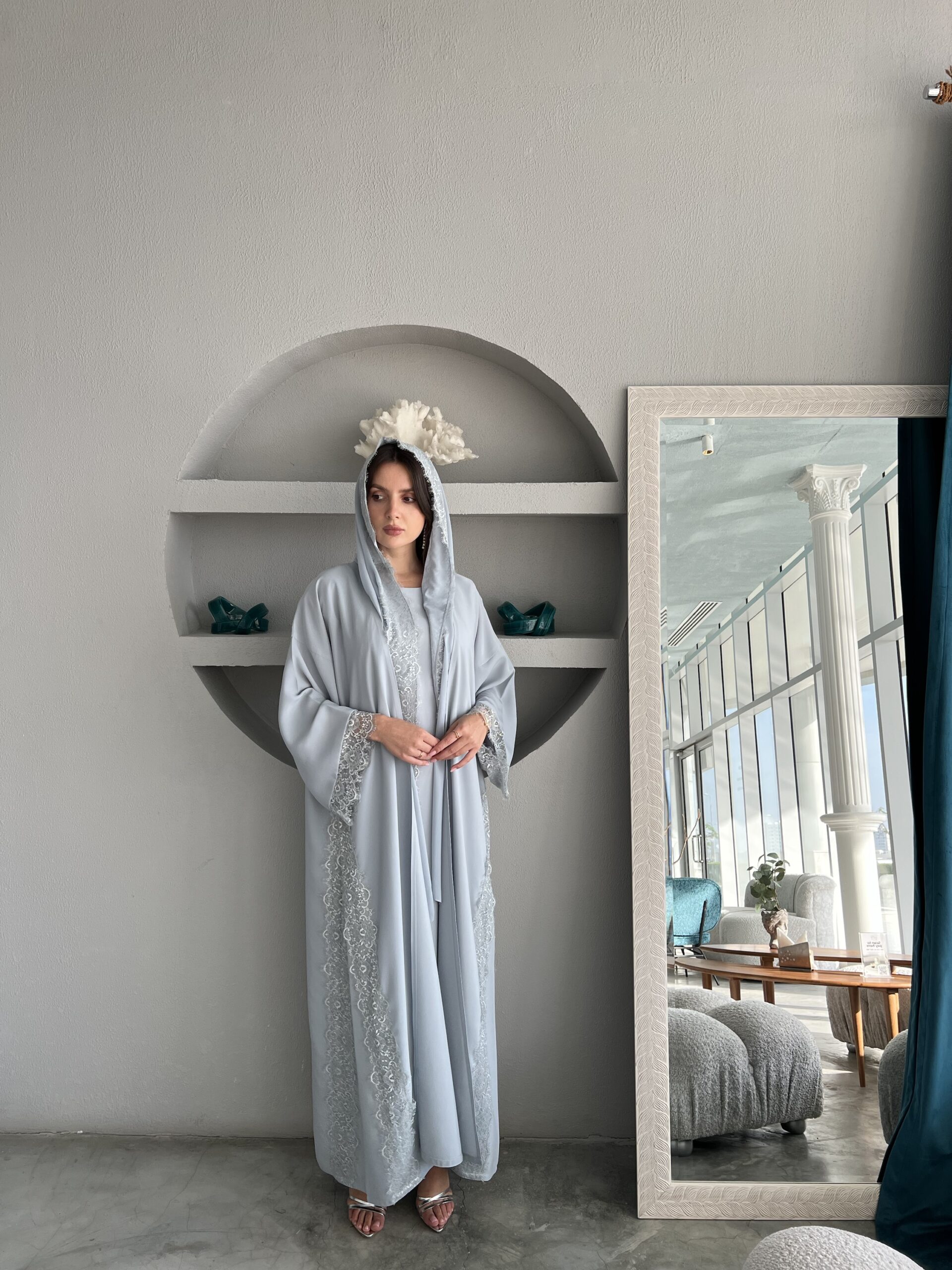 طقم  مكون من عباية وفستان وشيلة باللون ازرق فاتح مع دانتيل