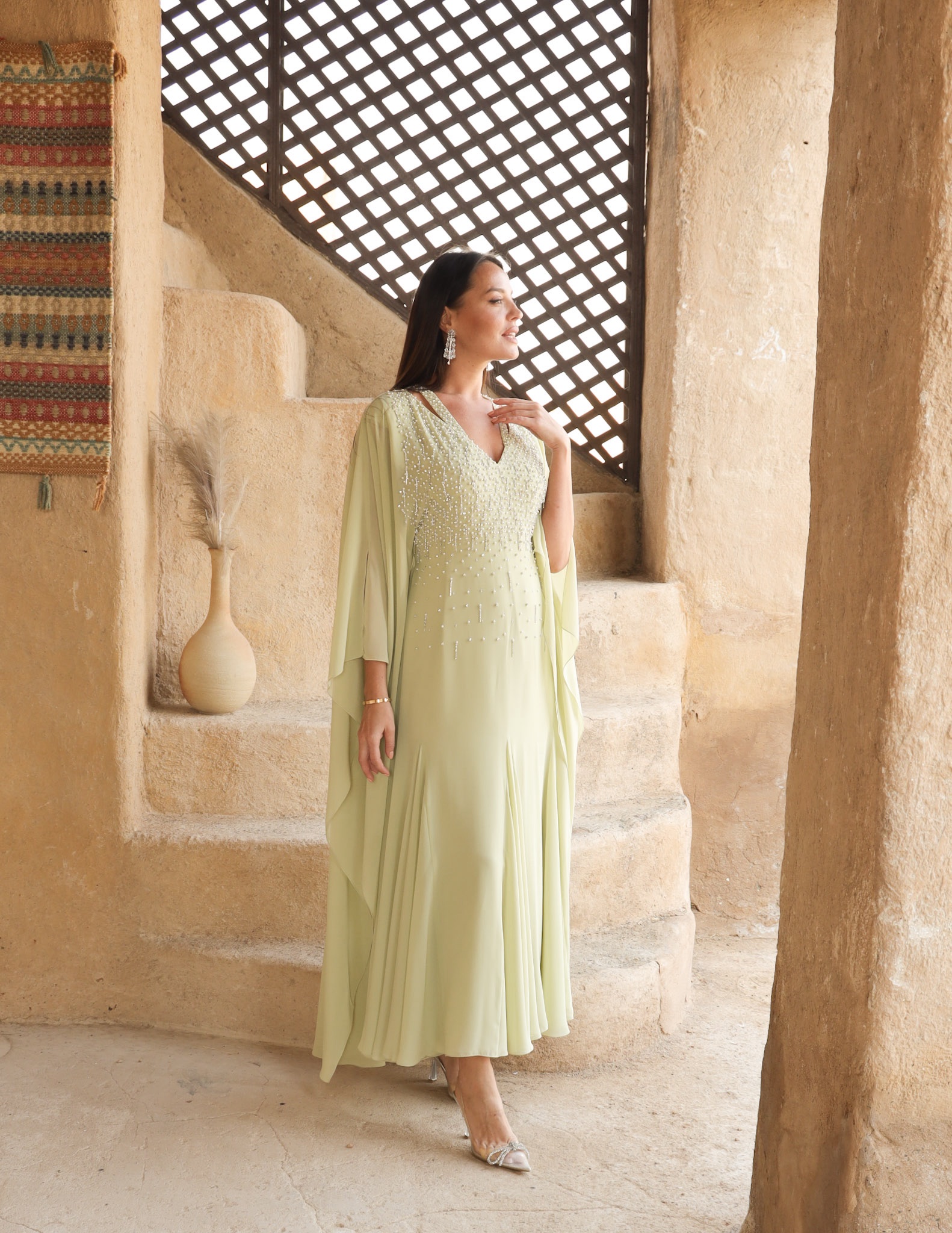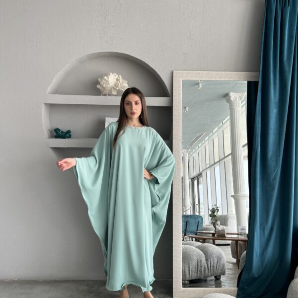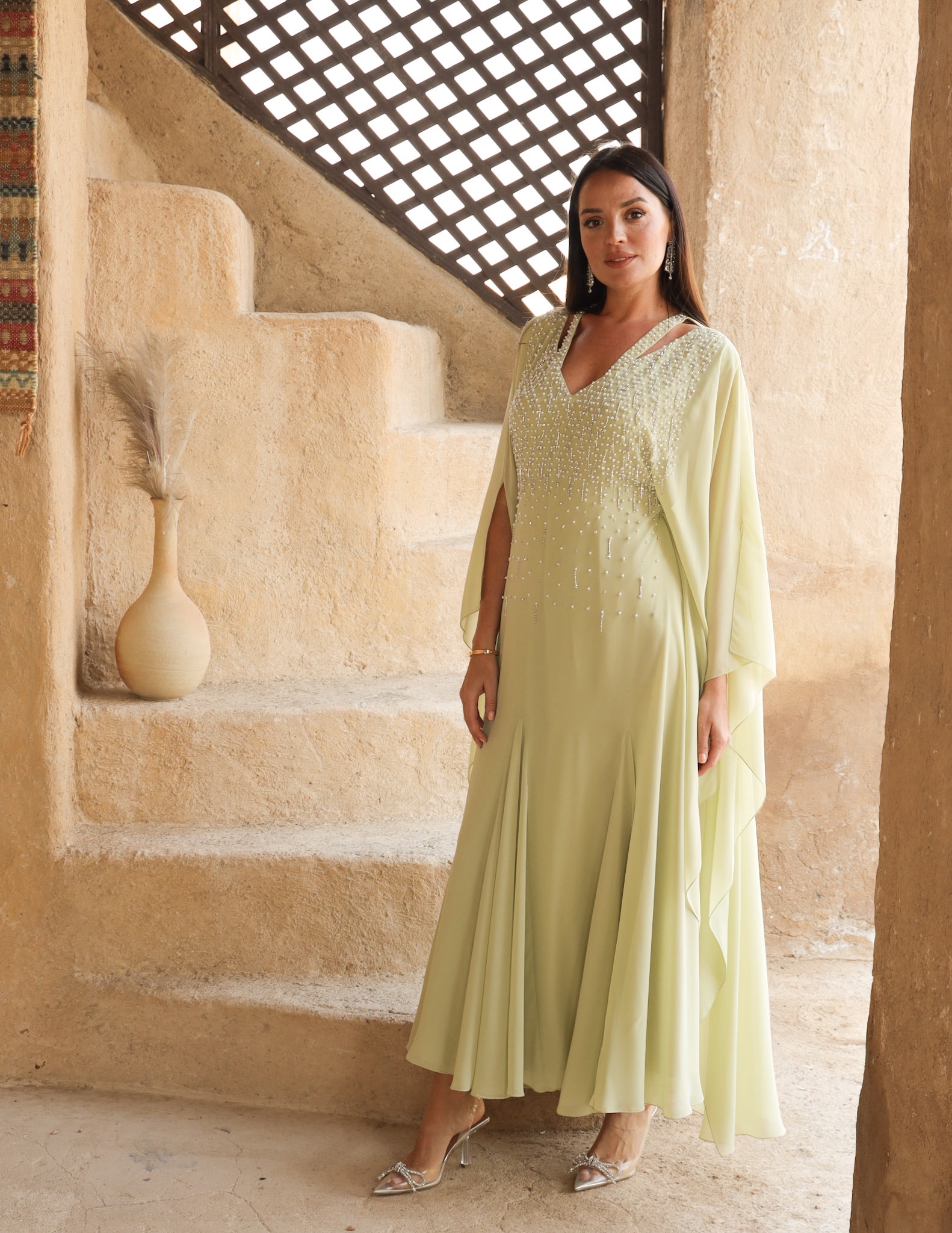 .فستان شيفون باللون اخضر فاتح مع تطريز يدوي
