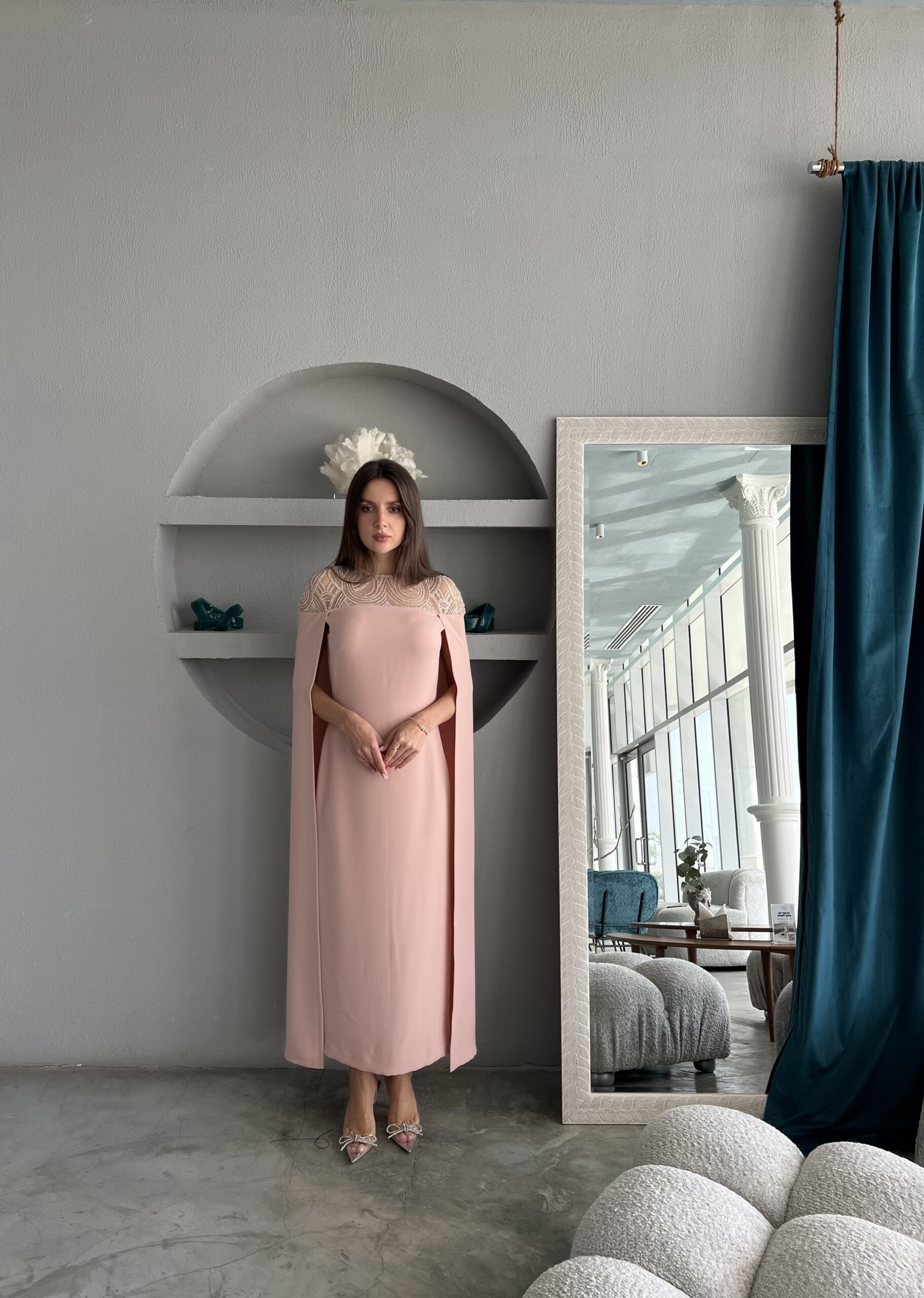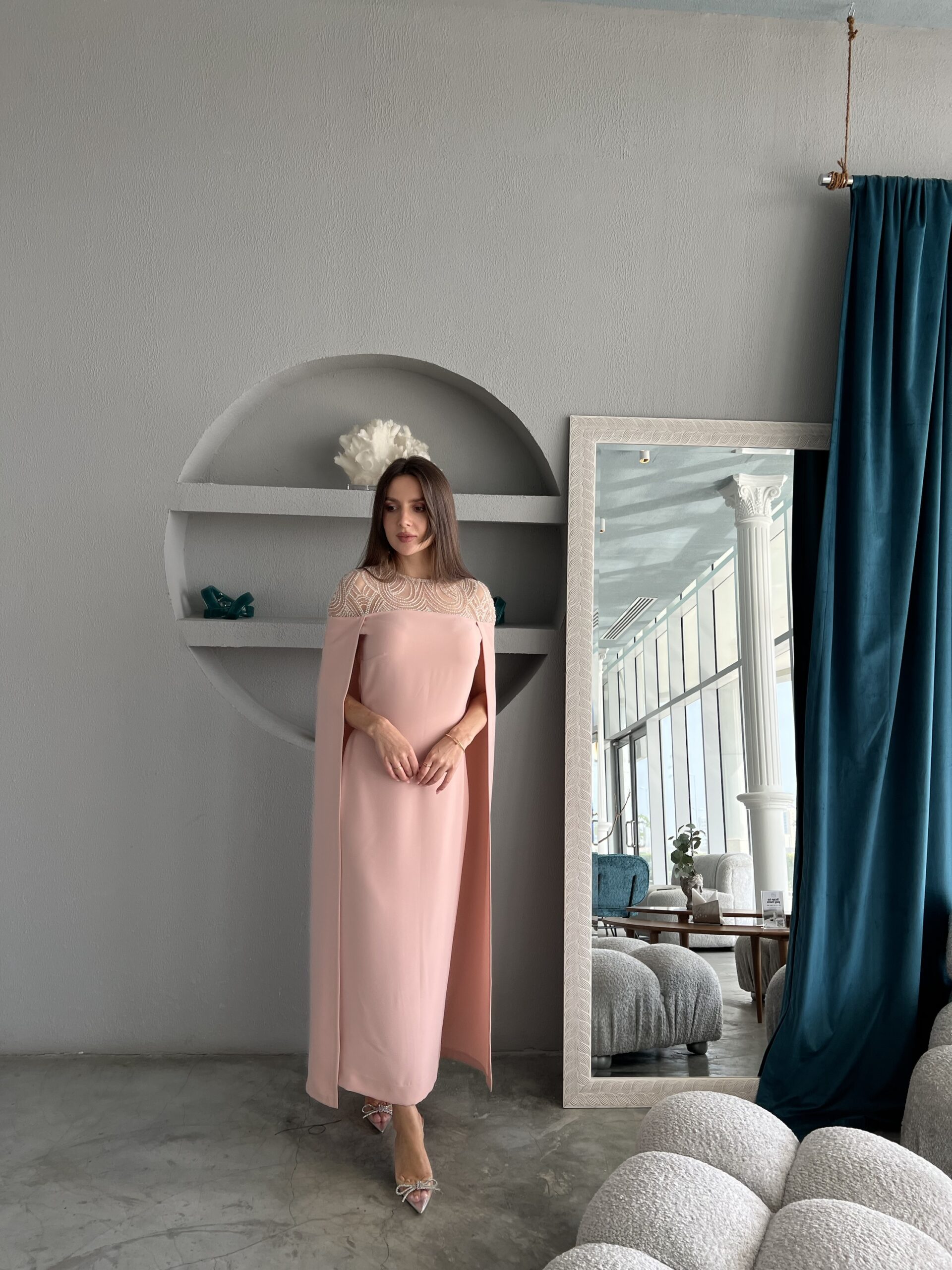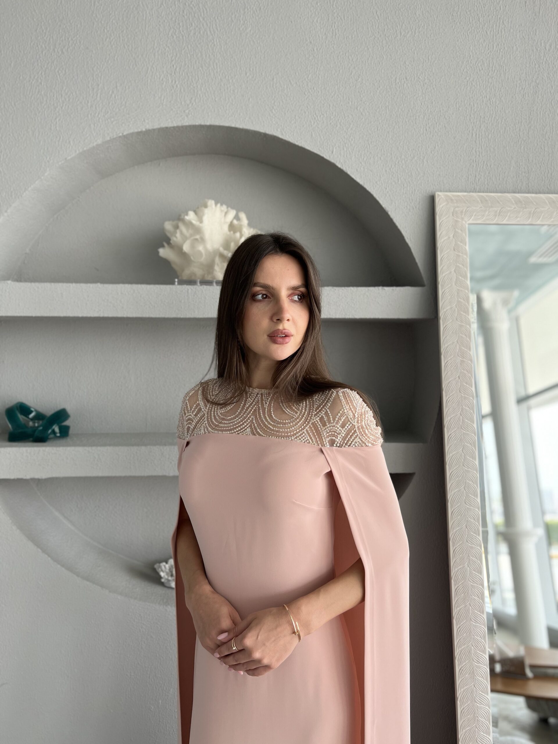 فستان باللون البطيخي مع تطريز بالكريستال